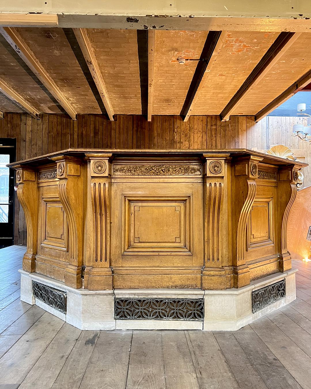 Ce bar, à la fois robuste et raffiné, offre un charme intemporel, parfait pour un intérieur de caractère, un restaurant ou un hôtel souhaitant évoquer l’élégance des établissements d’autrefois.