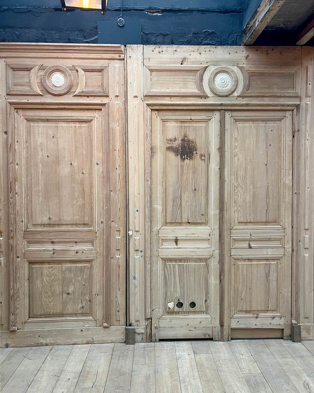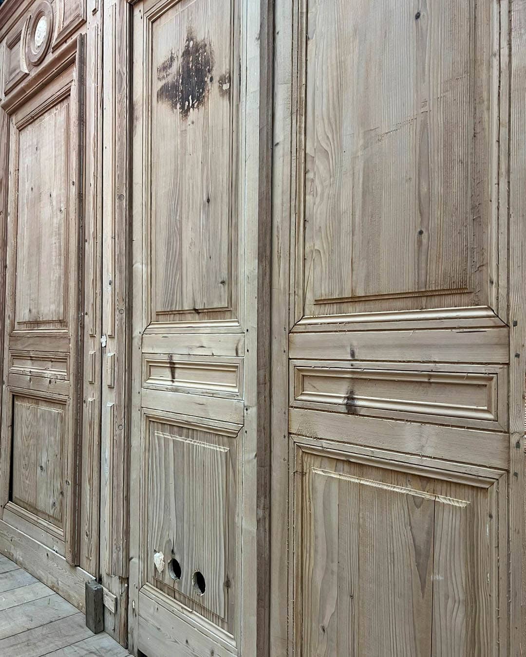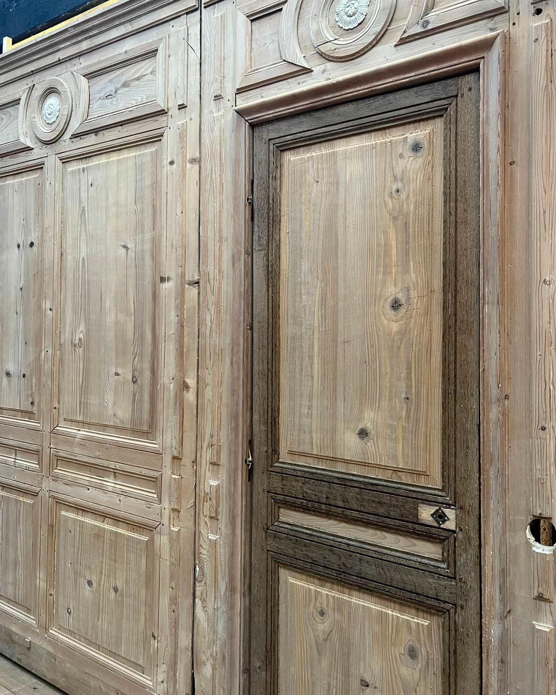 Boiserie parisienne début XXe en sapin, 14 m linéaires, au charme authentique et à la patine d’origine, idéale pour un décor élégant.