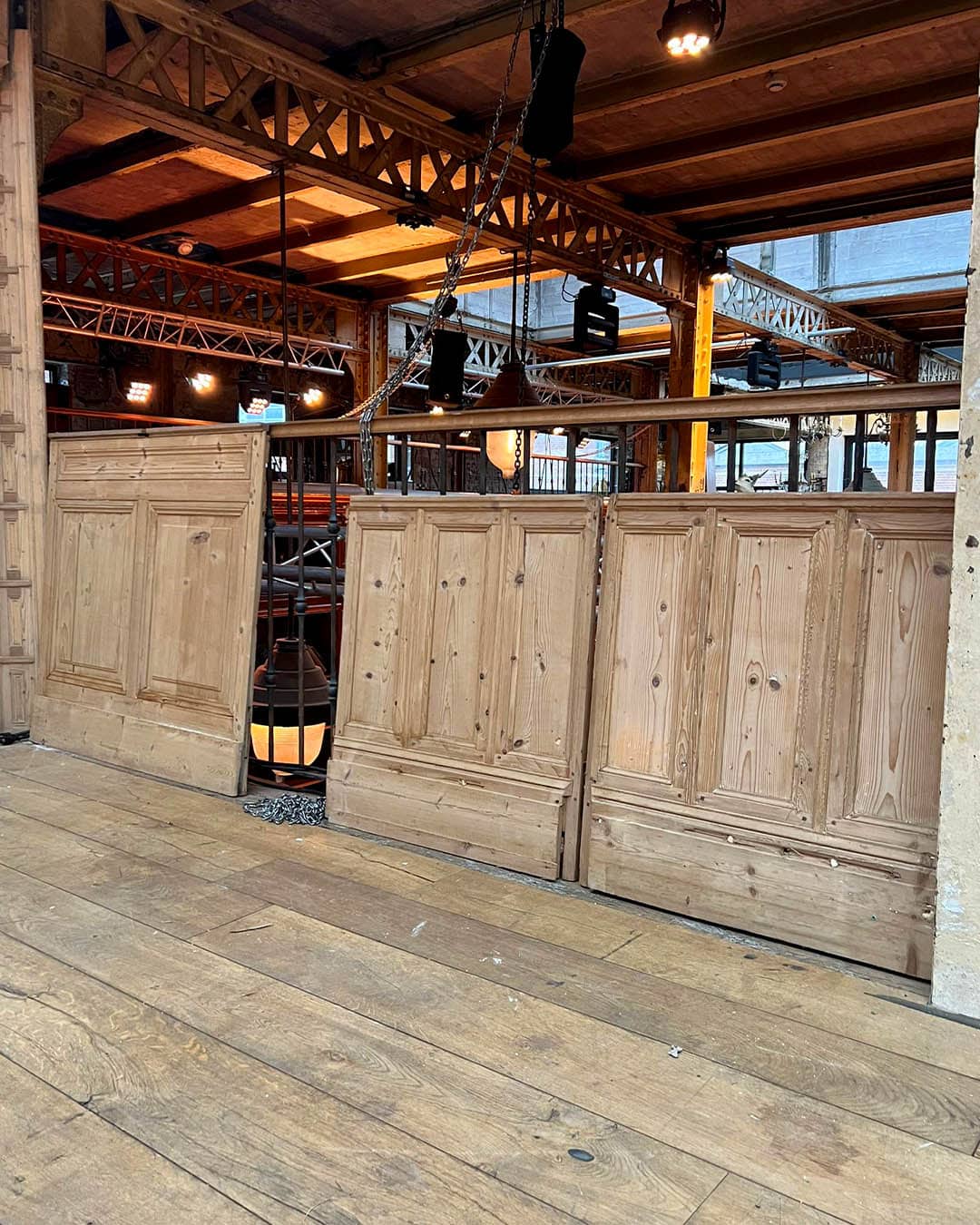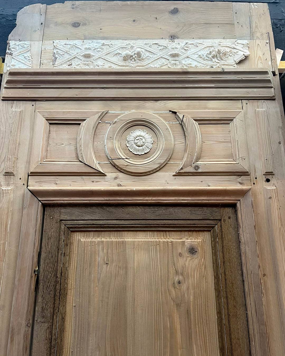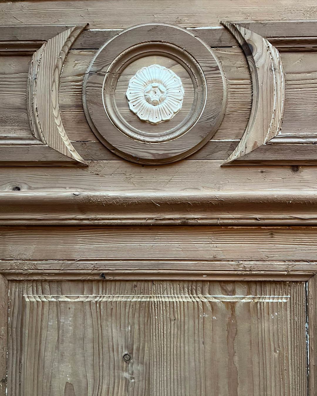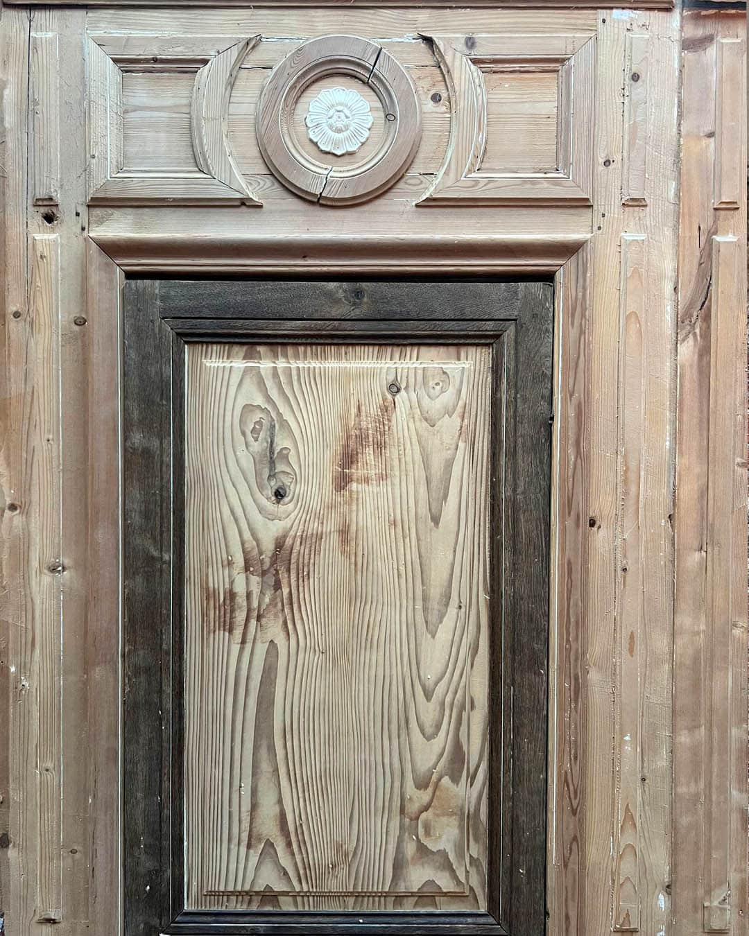 Boiserie parisienne début XXe en sapin, 14 m linéaires, au charme authentique et à la patine d’origine, idéale pour un décor élégant.