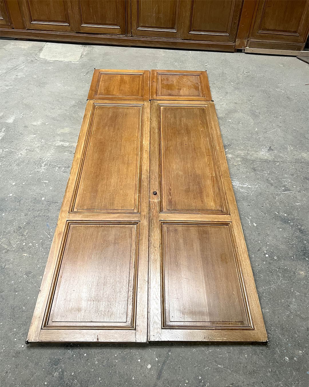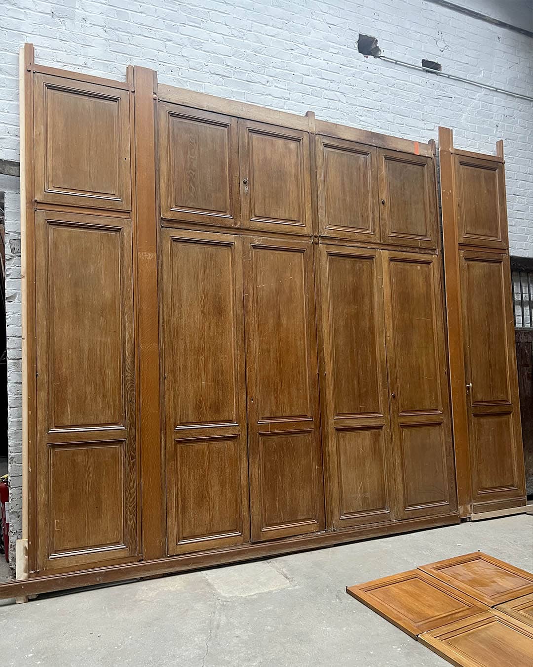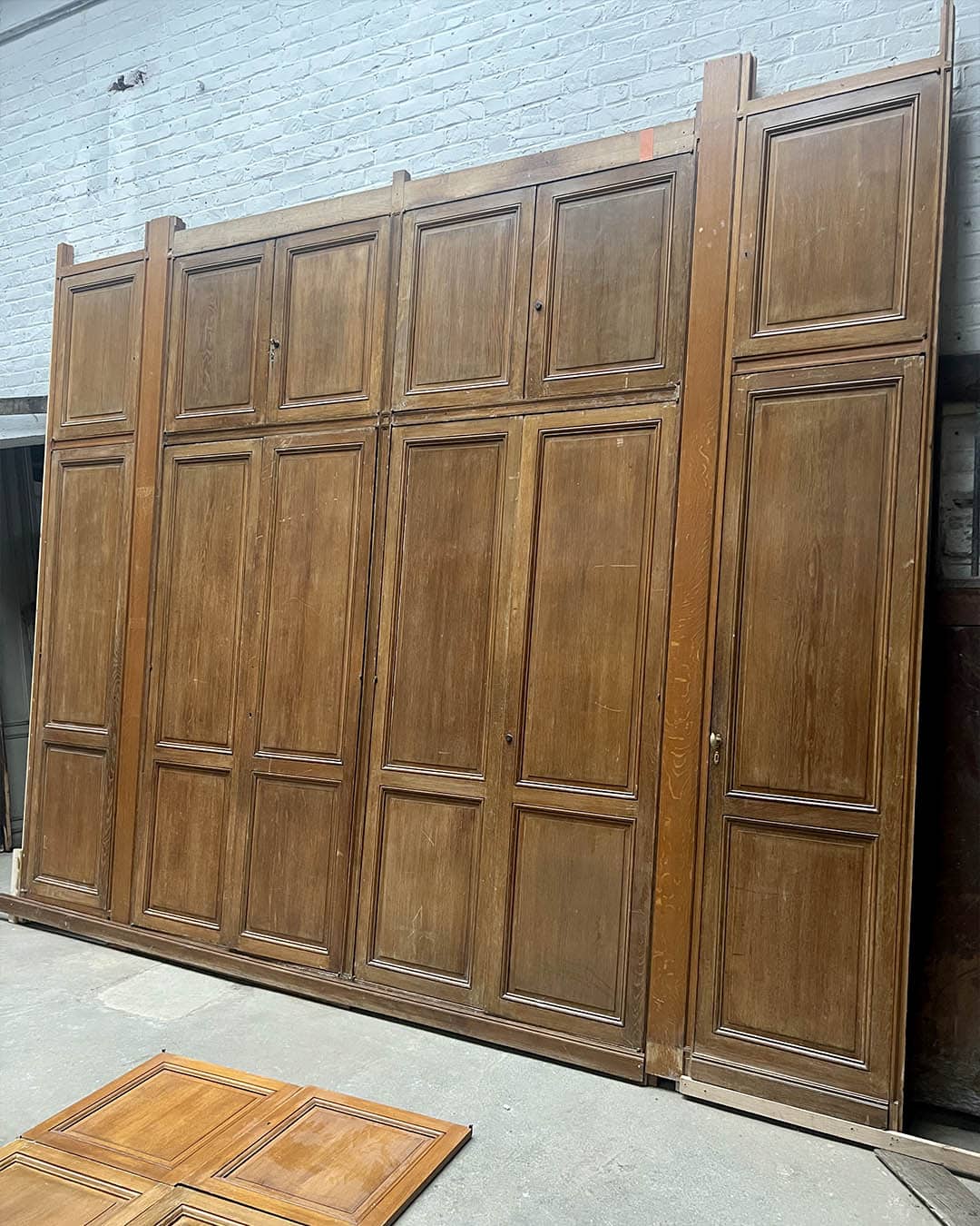 Façade de placard 415×341 cm, en bois patiné, idéale pour structurer un grand espace avec charme et caractère.