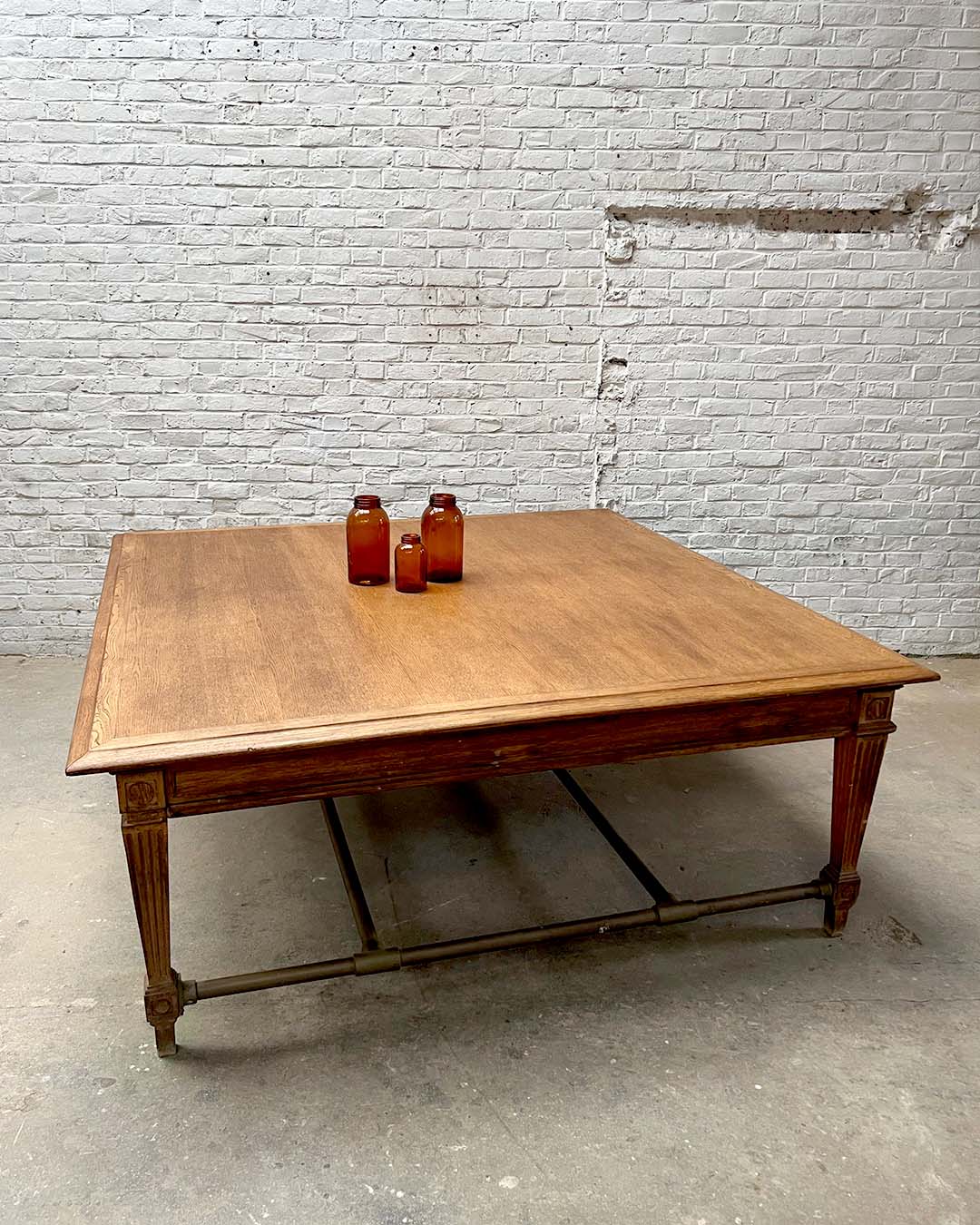 Imposante table carrée en chêne provenant de la Bank of France, témoin du mobilier institutionnel français du début du XXᵉ siècle. Avec ses proportions généreuses (200 × 80 × 200 cm), elle allie solidité, élégance et fonctionnalité.
