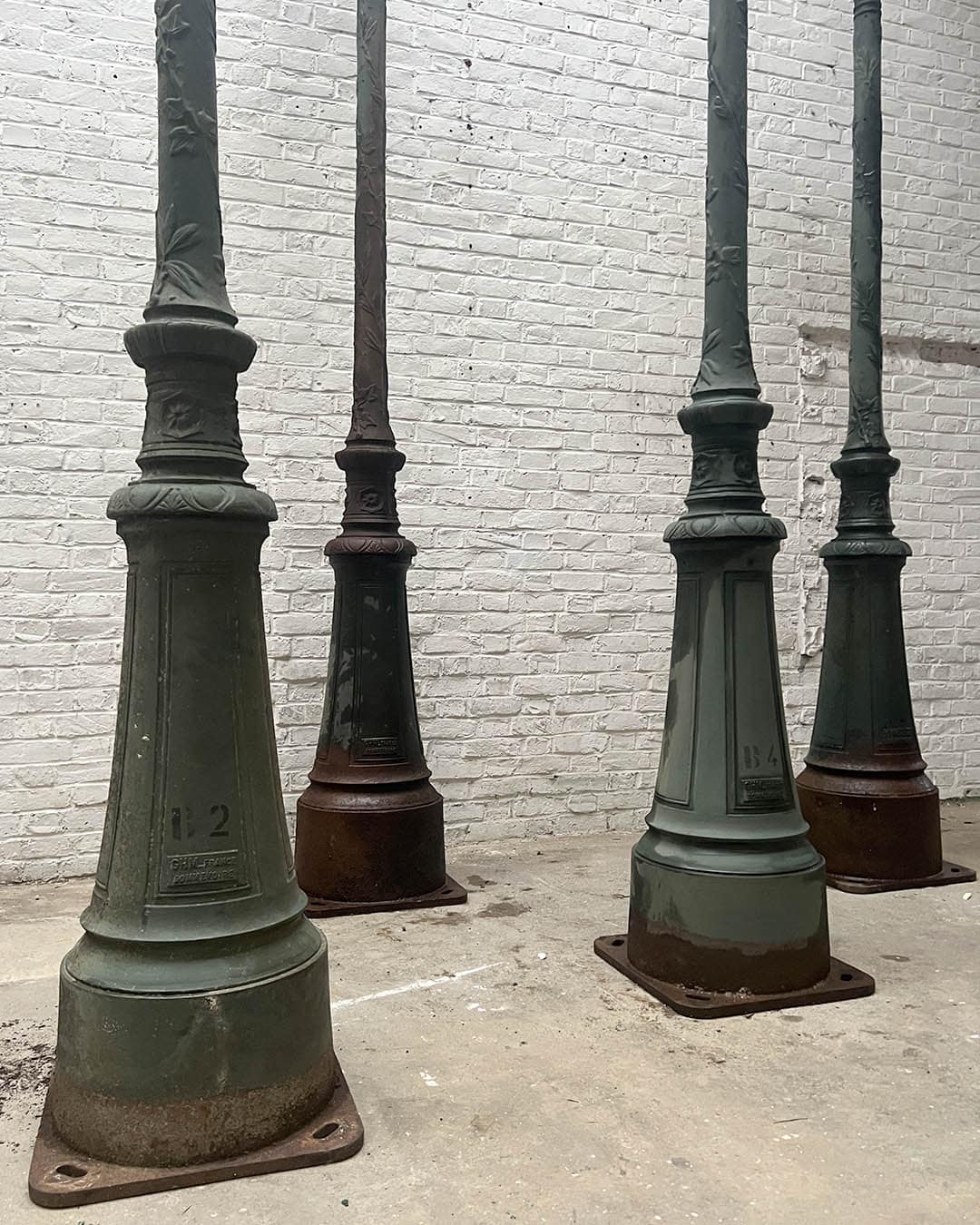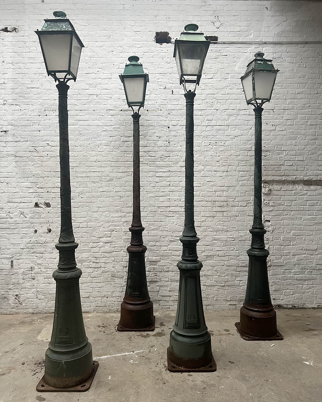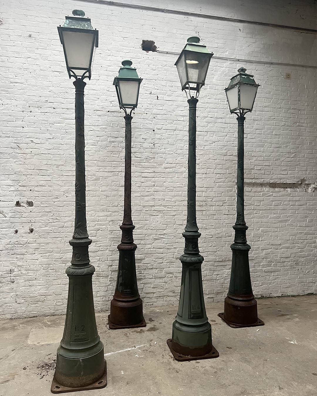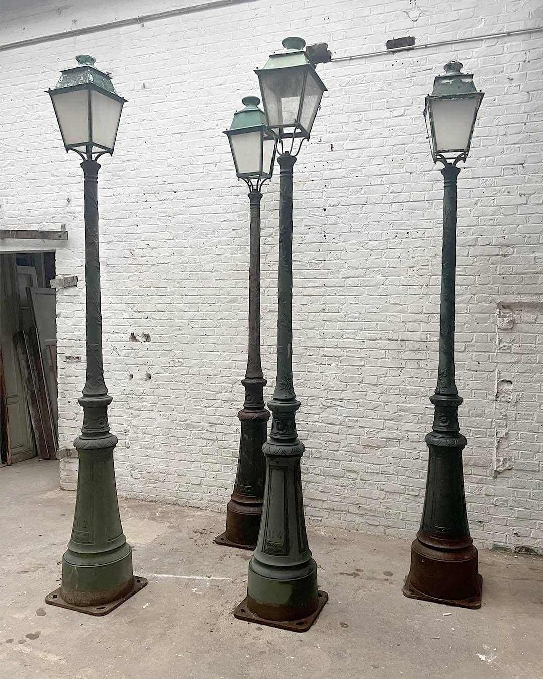 Magnifique ensemble de quatre candélabres (lampadaires) anciens en fonte, qui présentent des caractéristiques typiques du mobilier urbain français.
