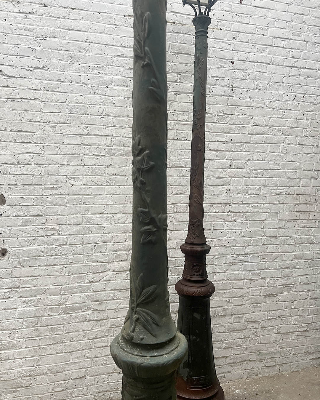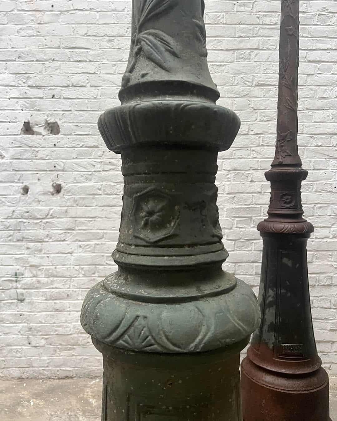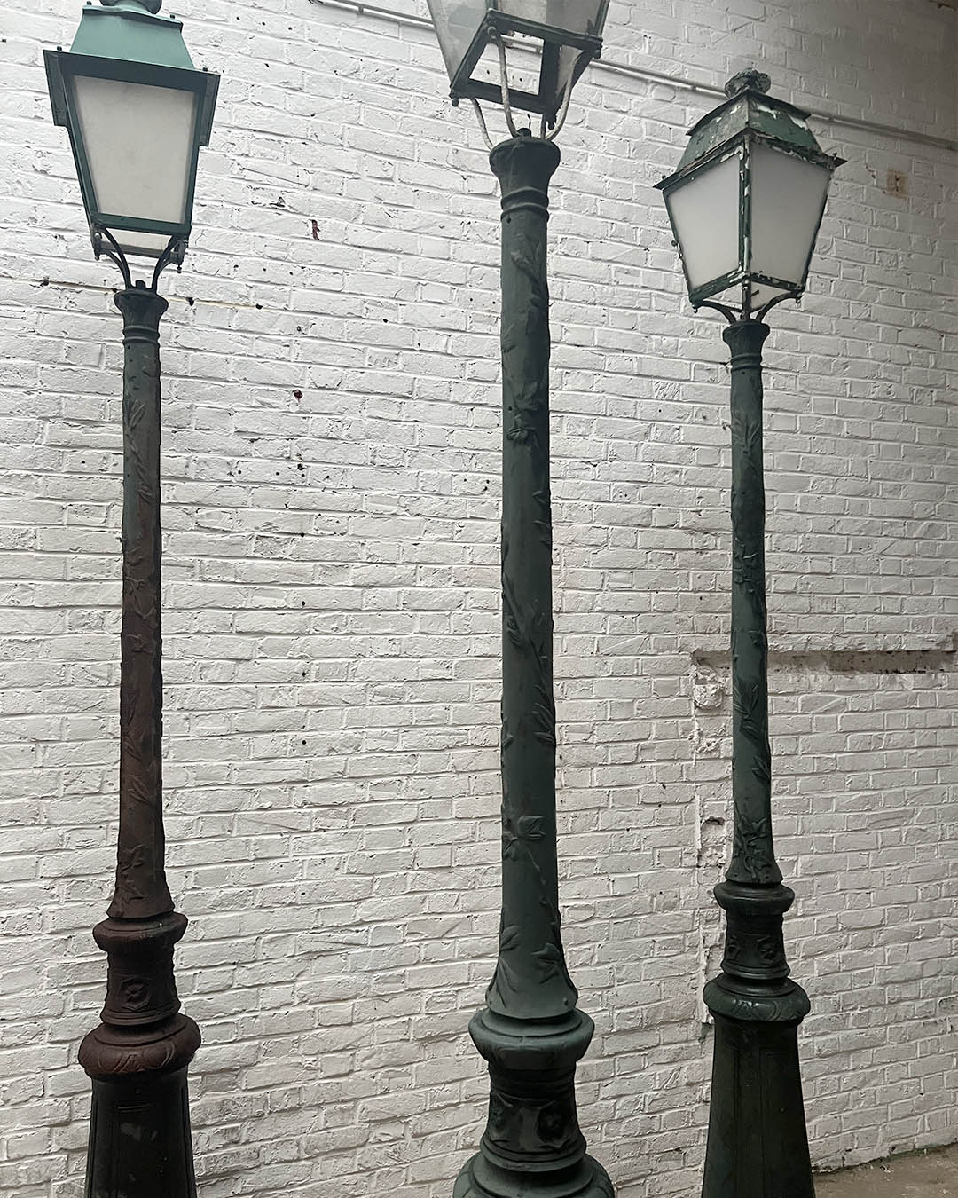 Magnifique ensemble de quatre candélabres (lampadaires) anciens en fonte, qui présentent des caractéristiques typiques du mobilier urbain français.