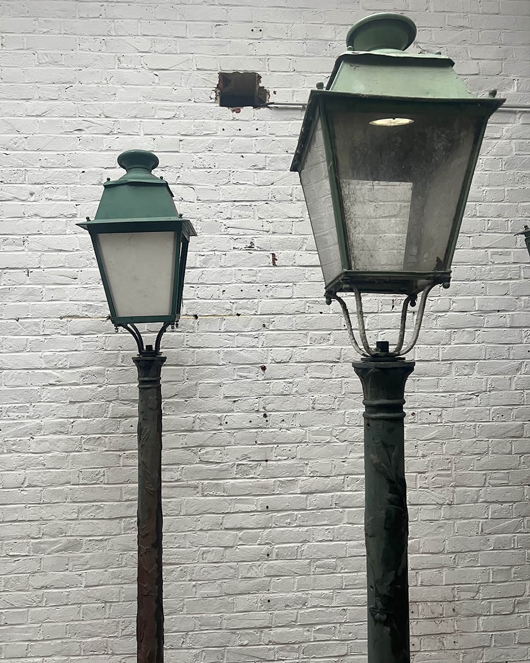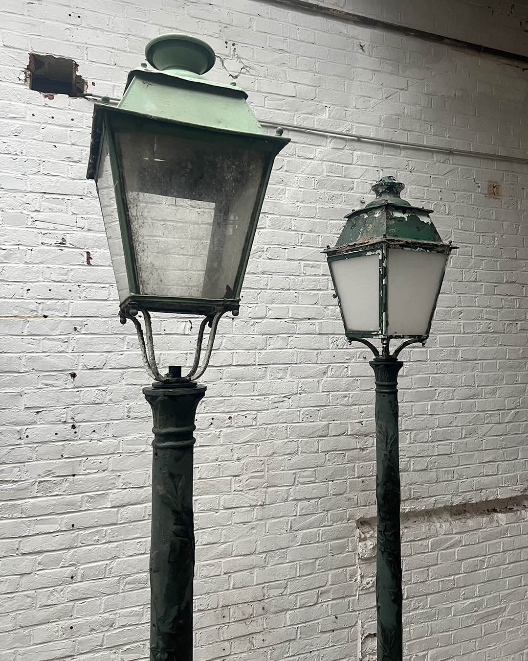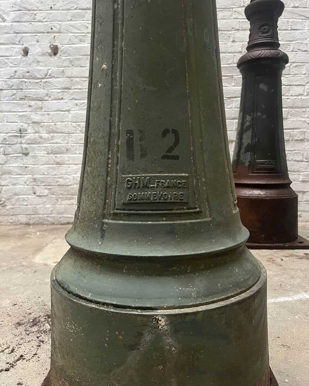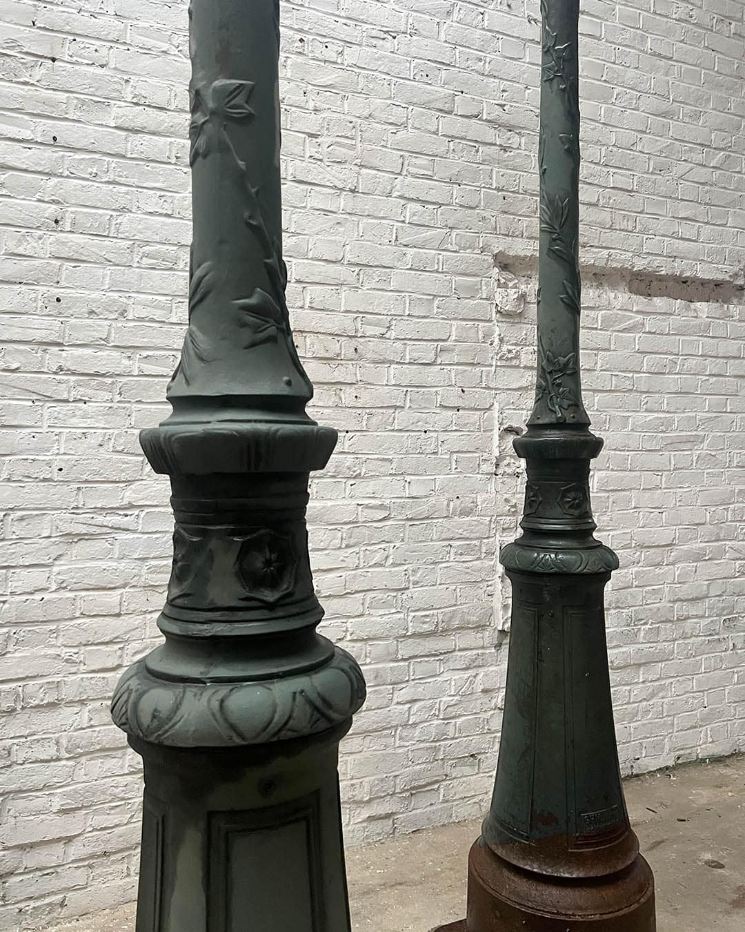 Magnifique ensemble de quatre candélabres (lampadaires) anciens en fonte, qui présentent des caractéristiques typiques du mobilier urbain français.