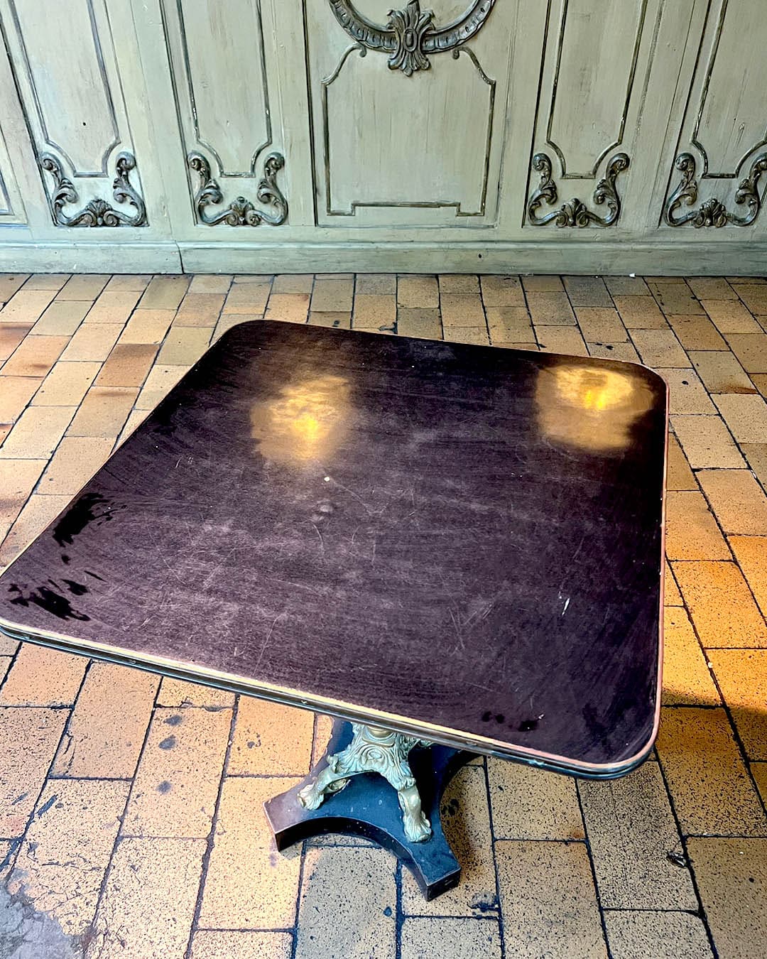 Paire de tables carrées en métal en bronze doré, socle en métal.
