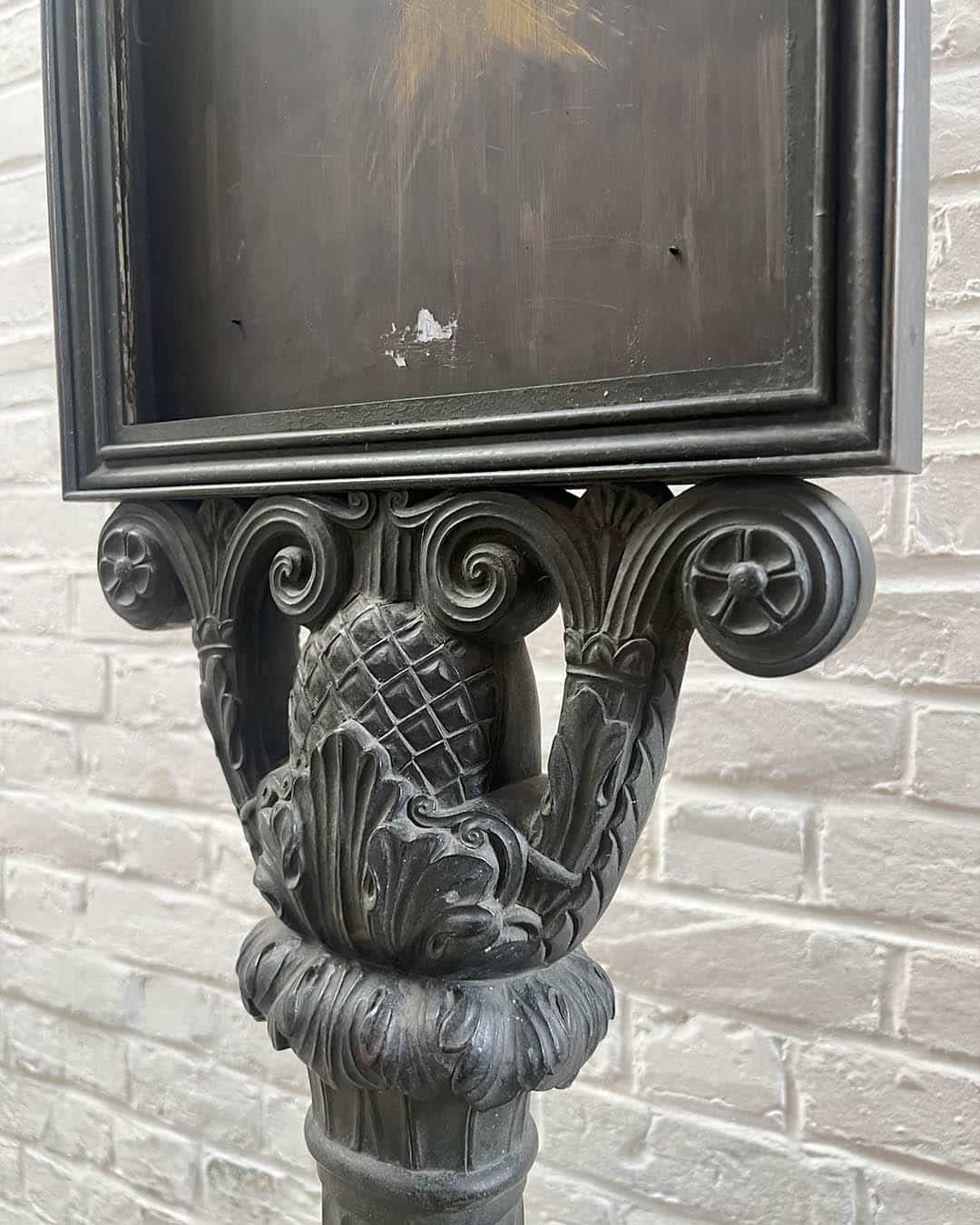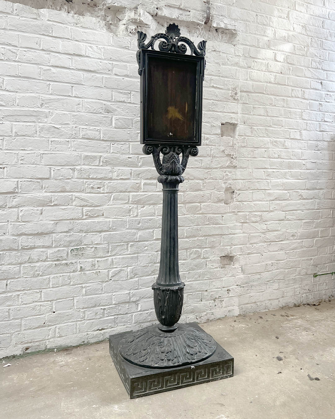 Porte-menu en fonte, base ornée d’une frise de grecques, le fût cannelé à décor de feuilles d’acanthes, et feuillages stylisés, cadre entouré de motifs de feuillages et d’enroulements, Napoléon III, 177.5x54x45 cm