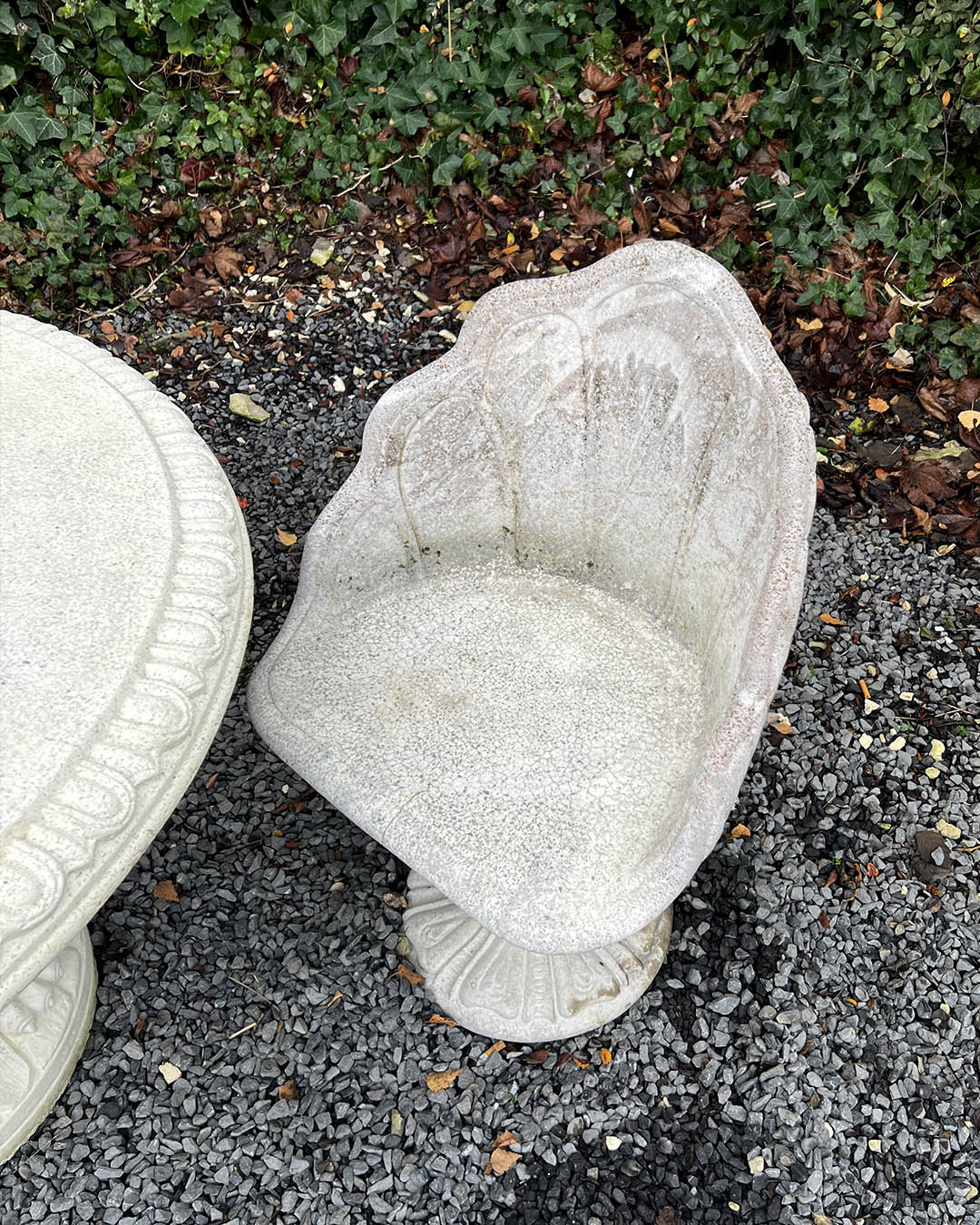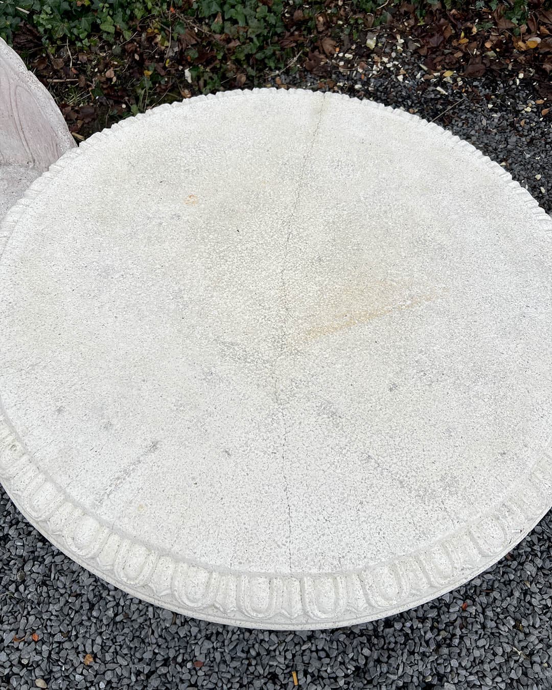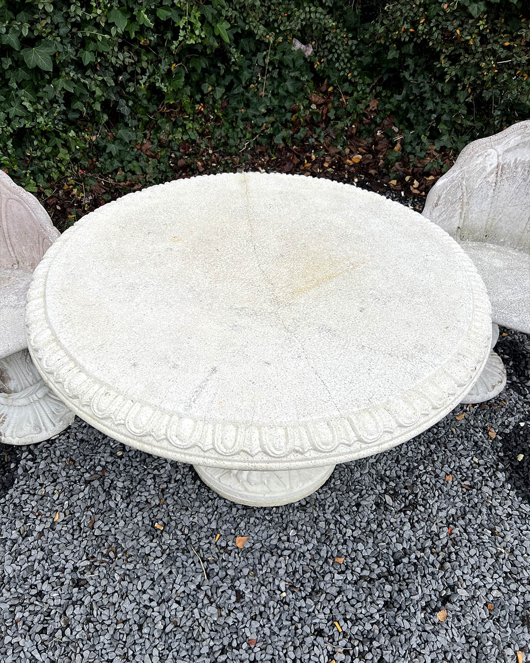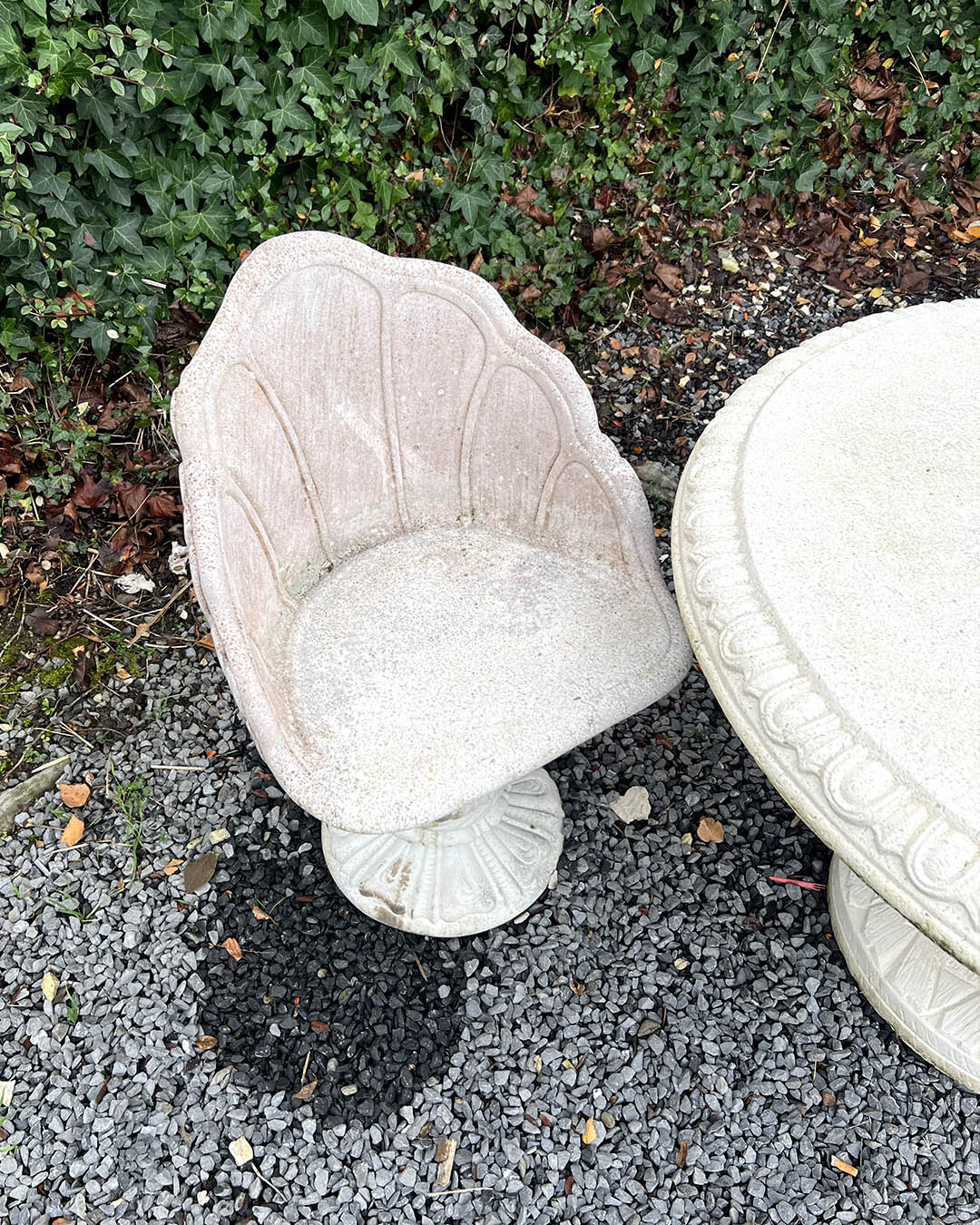 Salon de jardin en pierre reconstituée, au charme classique et à la robustesse durable, idéal pour un extérieur élégant.