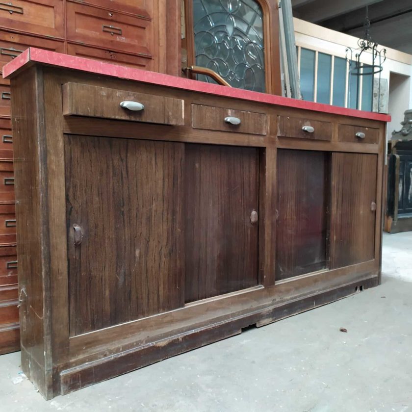 Arrière bar ancien avec dessus stratifié rouge, 114x230x30cm.