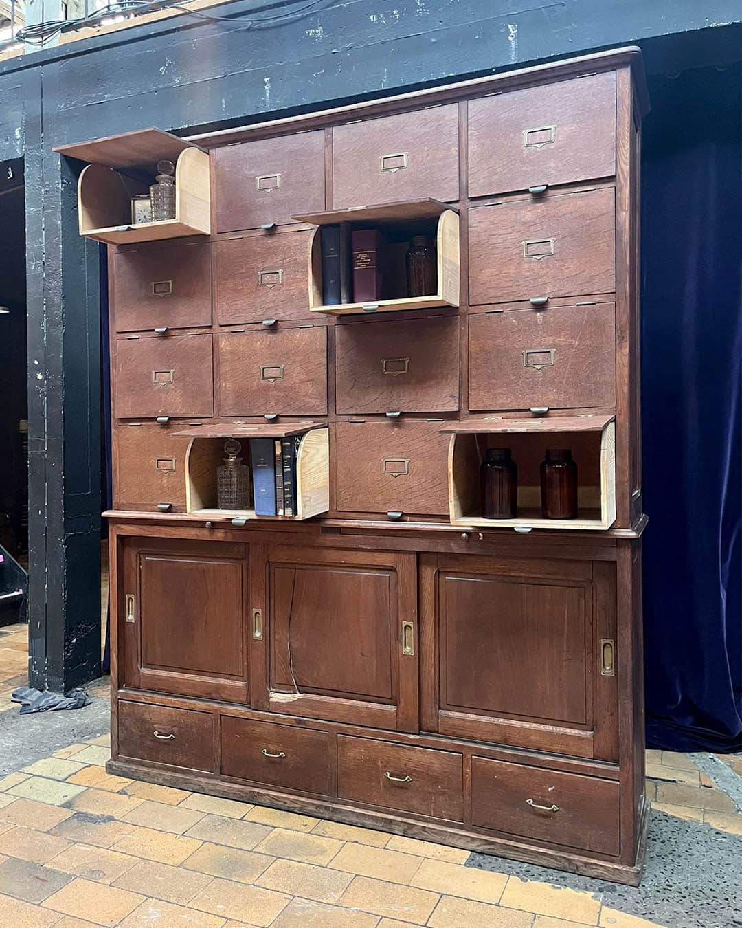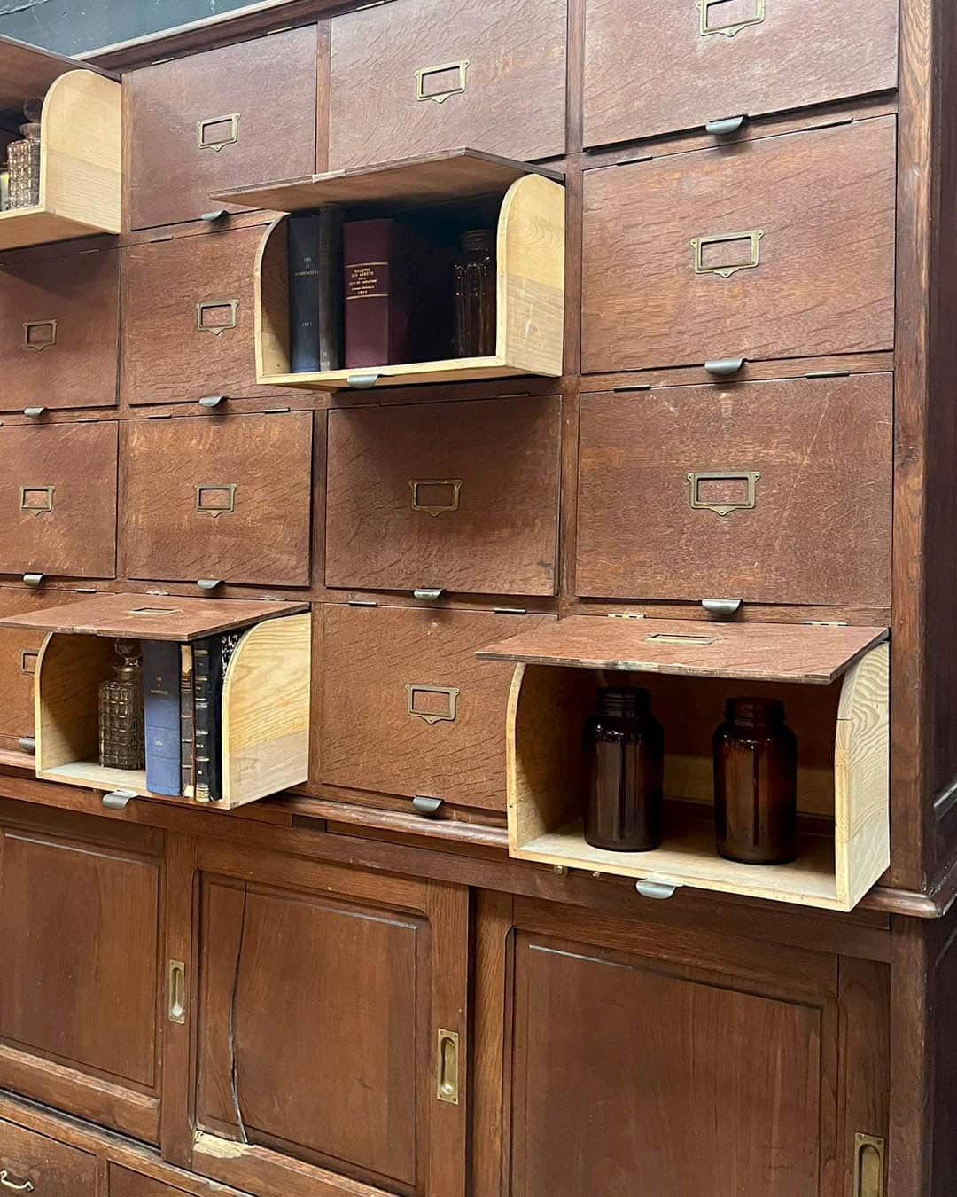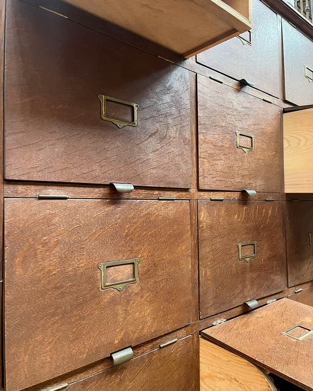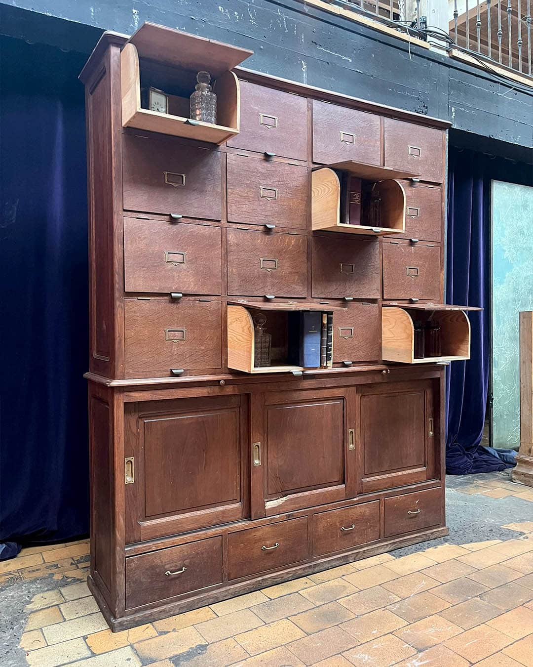 Grand classeur de notaire en chêne, à clapets et portes coulissantes.