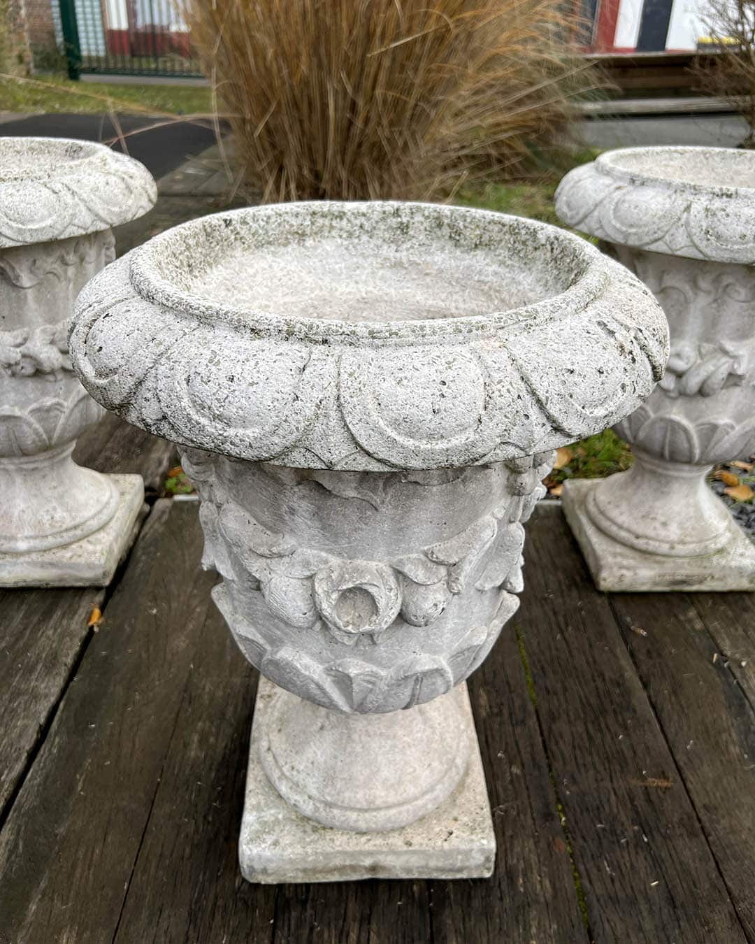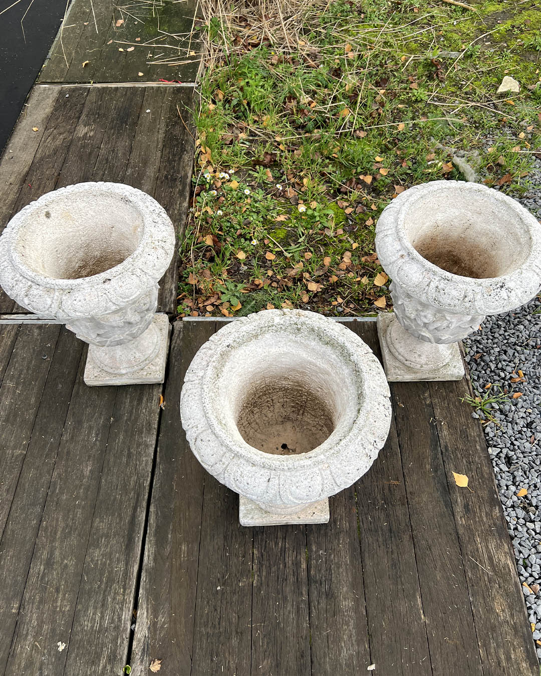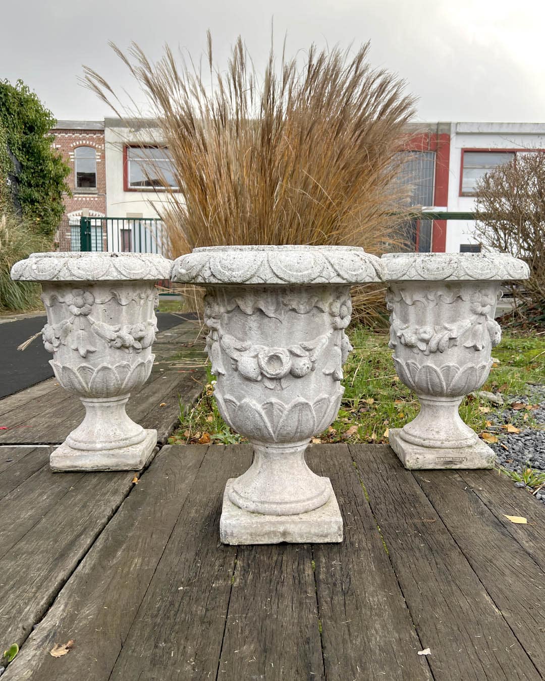 Lot de 3 vases de jardin en pierre reconstituée, au style classique et à la présence élégante, parfaits pour un extérieur de caractère.