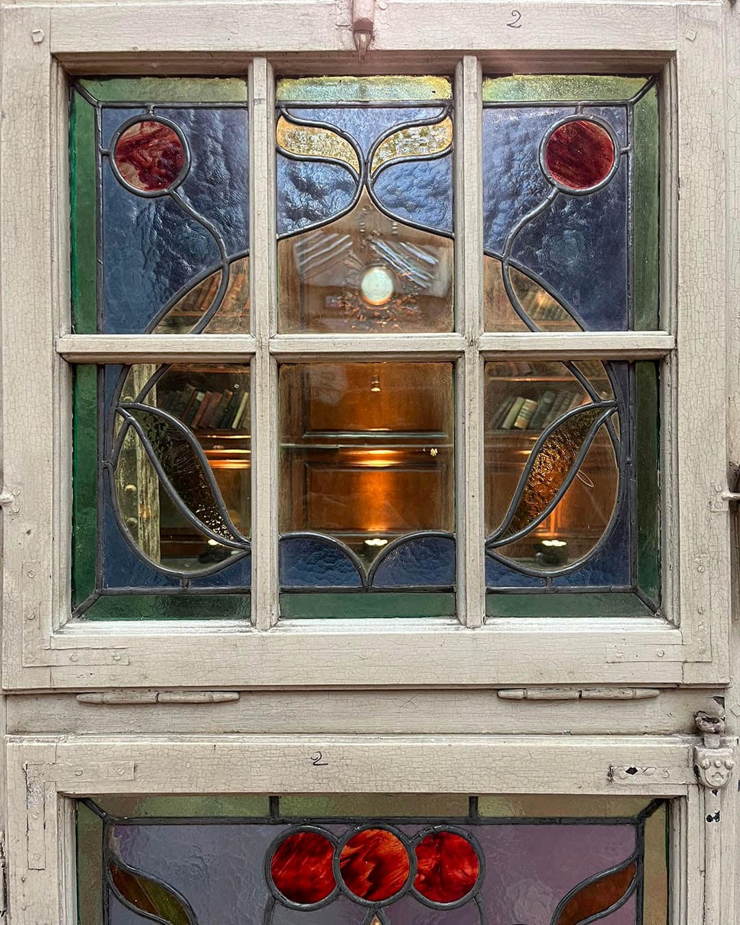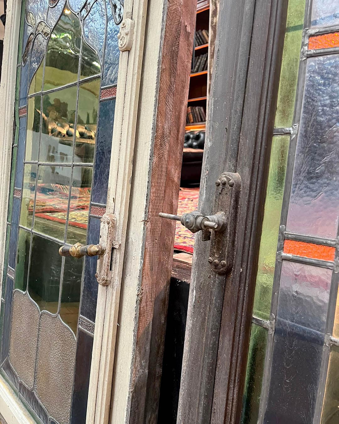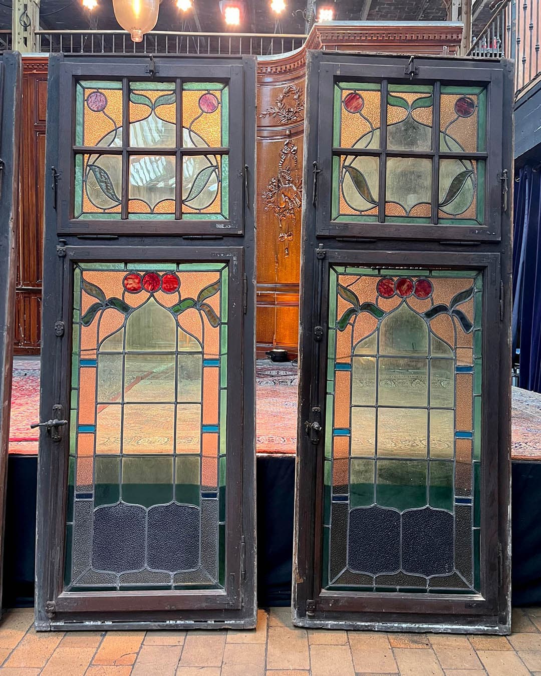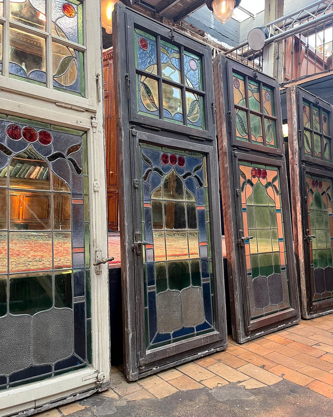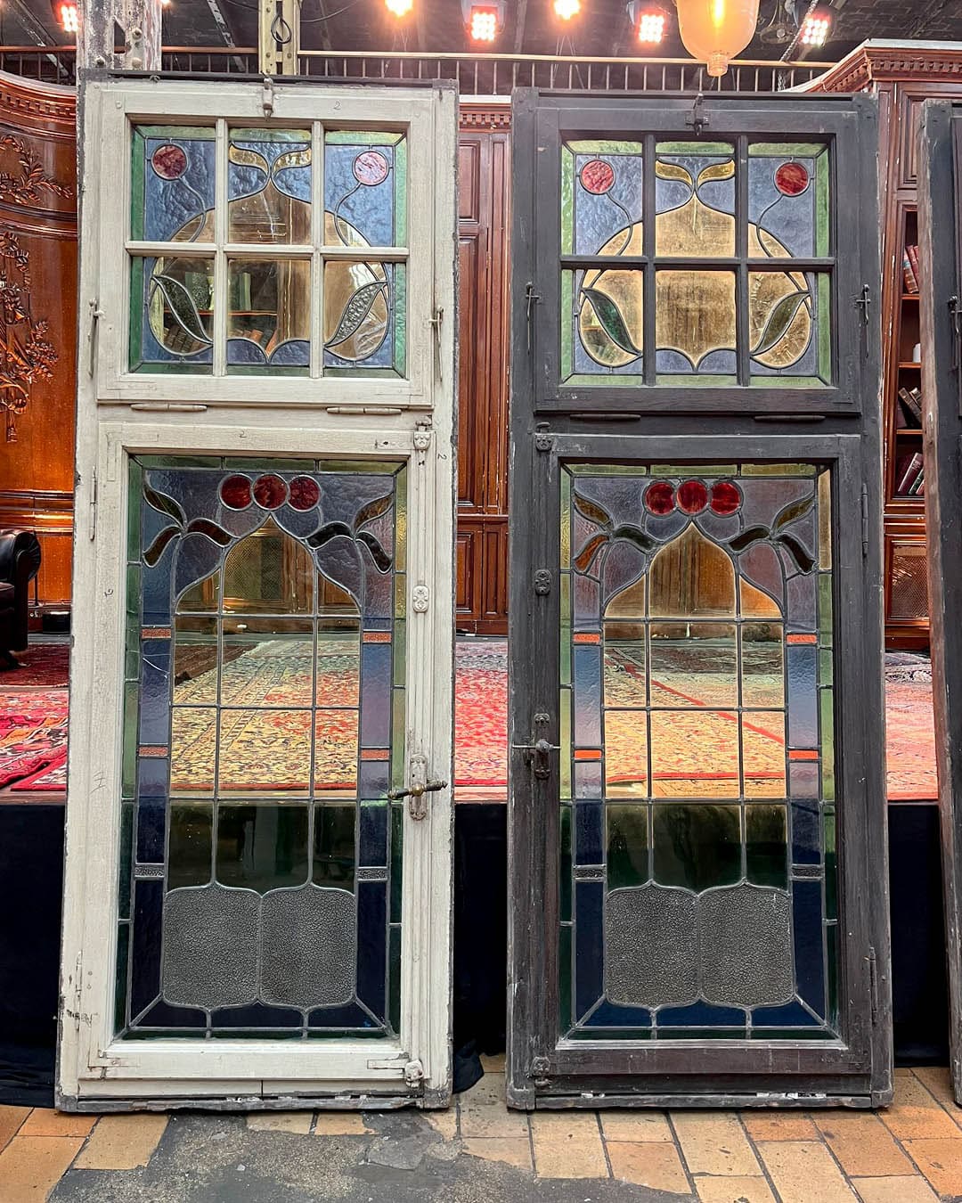 Lot de portes-fenêtres avec vitraux, au charme authentique et aux couleurs lumineuses, parfaites pour un intérieur de caractère.