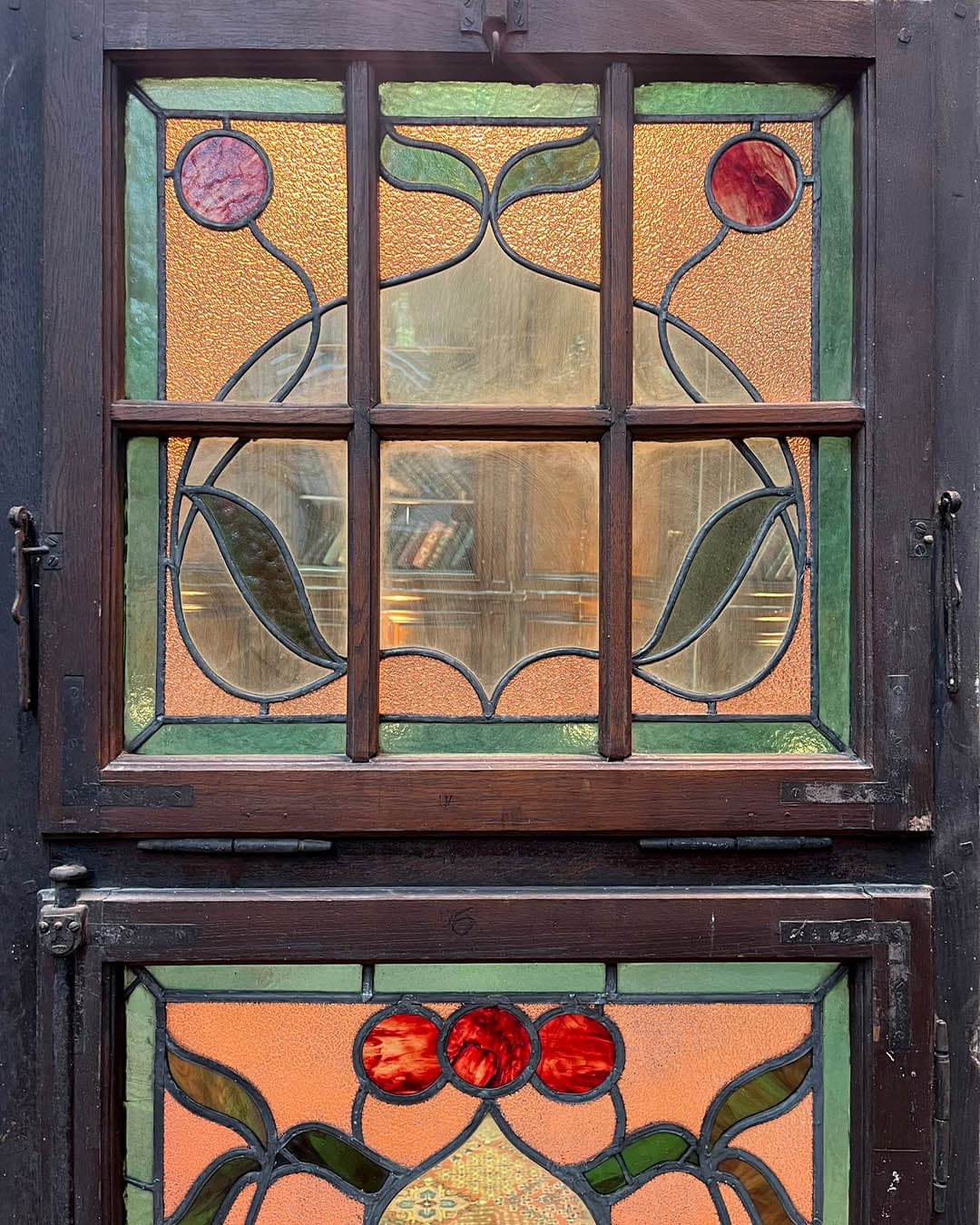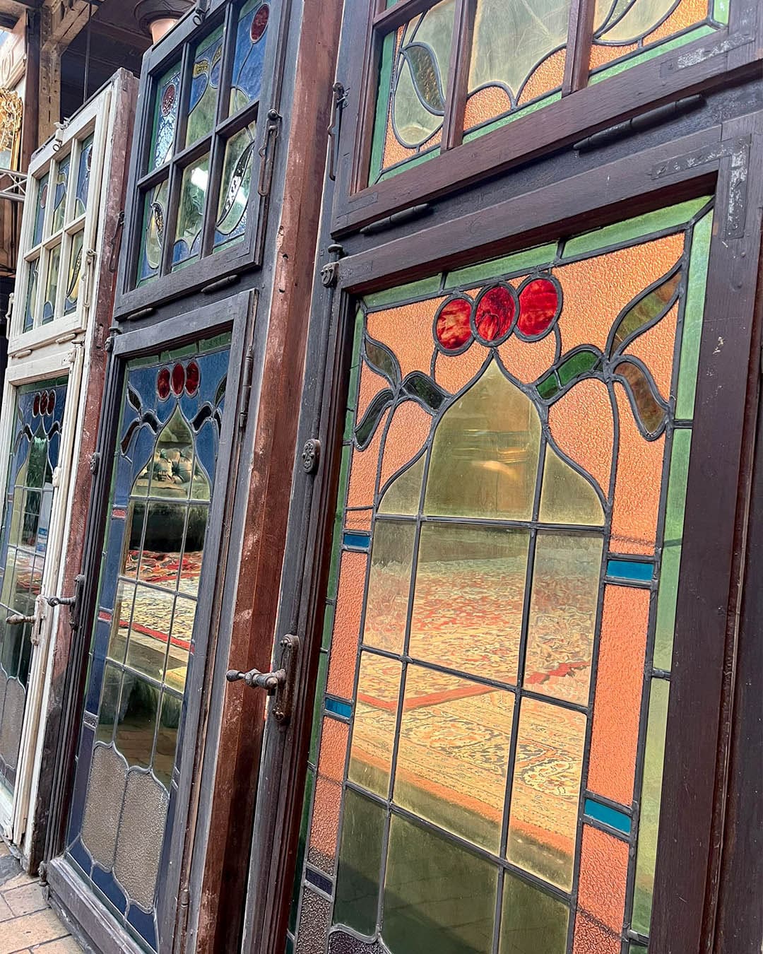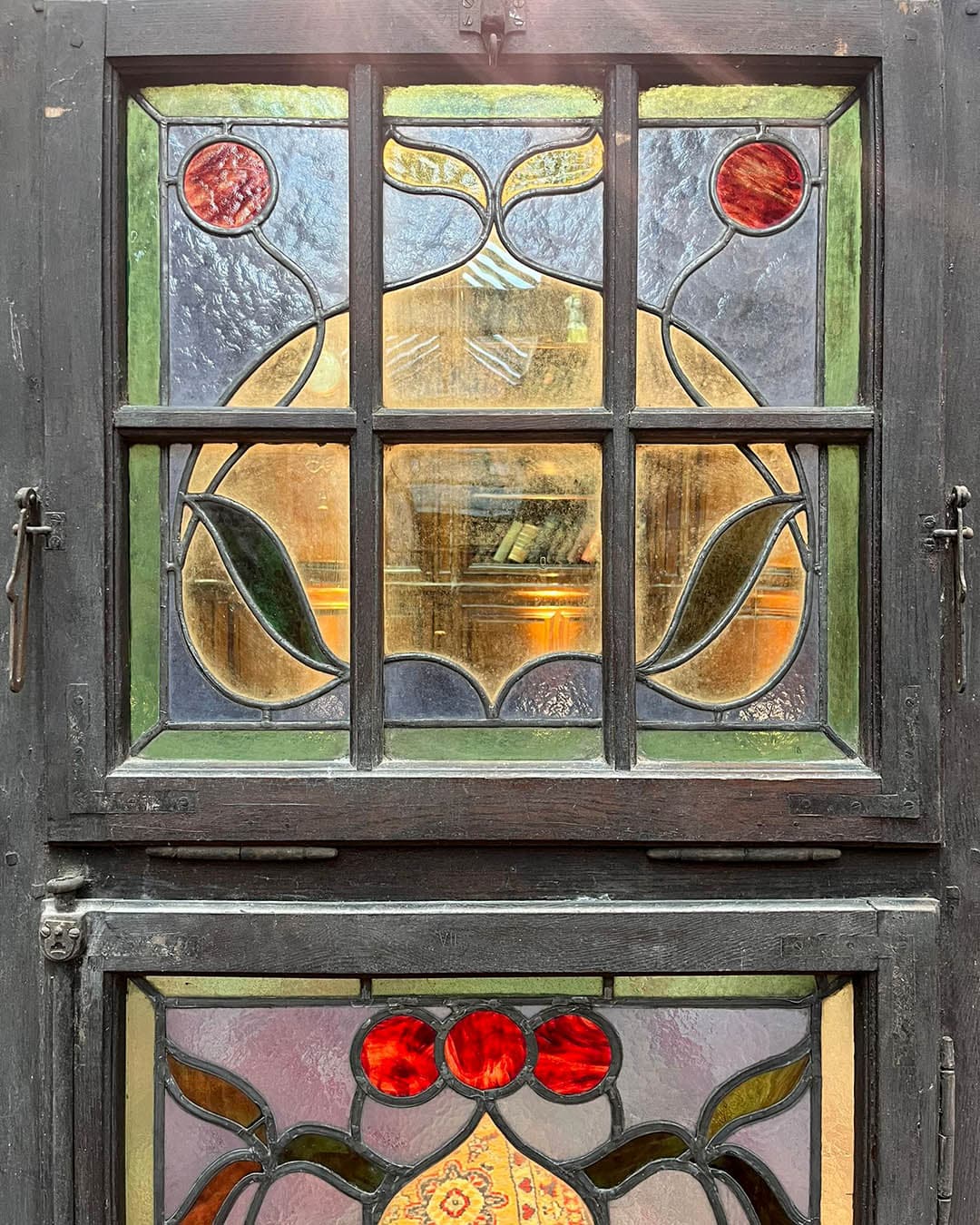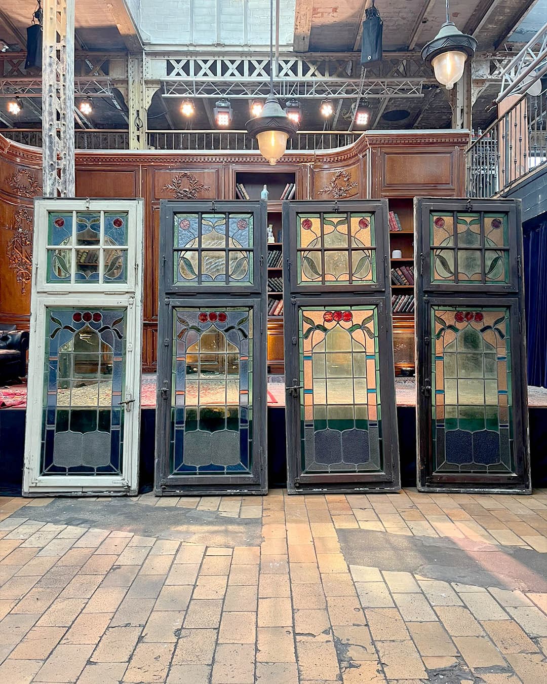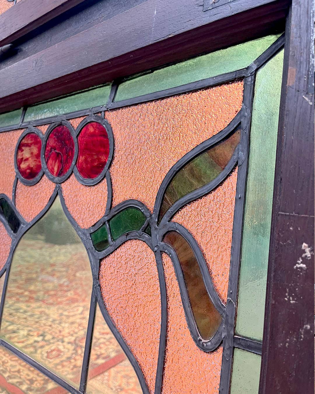 Lot de portes-fenêtres avec vitraux, au charme authentique et aux couleurs lumineuses, parfaites pour un intérieur de caractère.